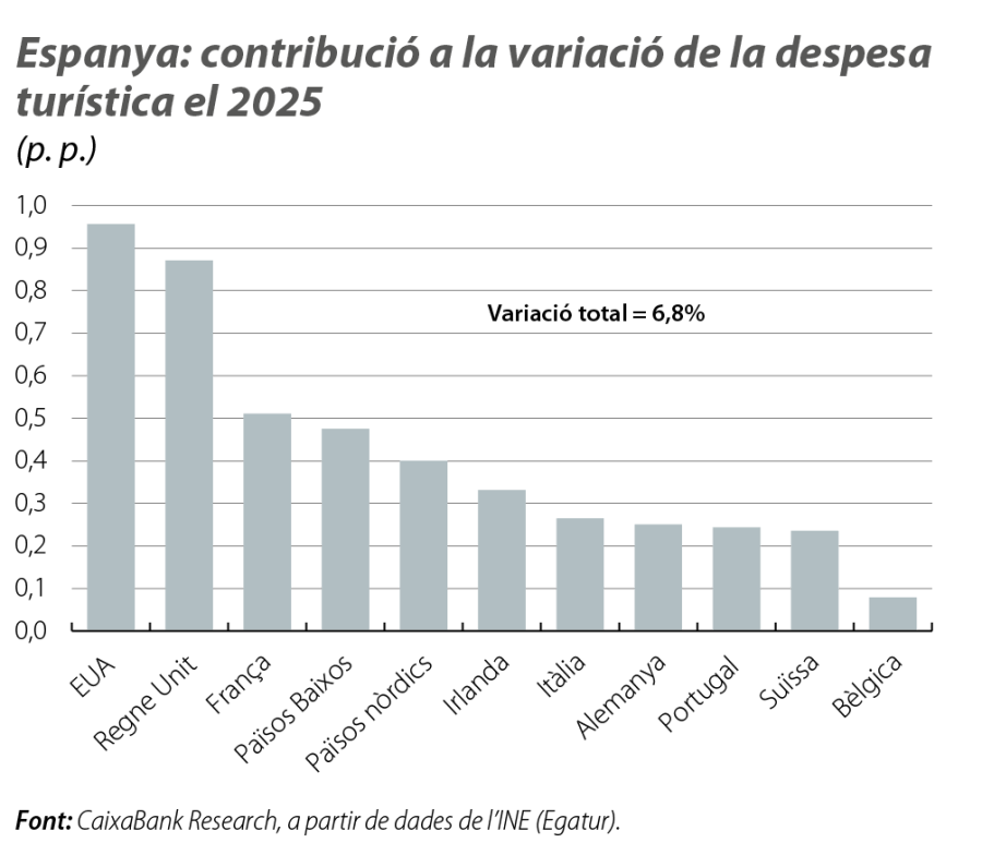 Quant a la balança de serveis, continua anotant superàvits rècord. D’una banda, el turisme va tornar a ser el motor de la balança corrent i va demostrar una gran resiliència malgrat la desacceleració econòmica global, amb un superàvit que es va mantenir molt a la vora dels màxims històrics (el 4,2% del PIB vs. el 4,3% anterior).5 De l’altra, la depreciació del dòlar enfront de l’euro no va reduir l’arribada de viatgers nord-americans, un dels mercats amb una despesa mitjana més elevada.6 Ben al contrari, va ser el mercat que més va contribuir al creixement de la despesa total i, dins els no europeus, el que més va aportar al creixement de l’entrada de turistes (vegeu el tercer gràfic).
