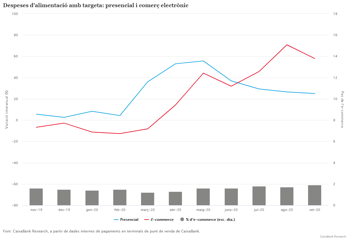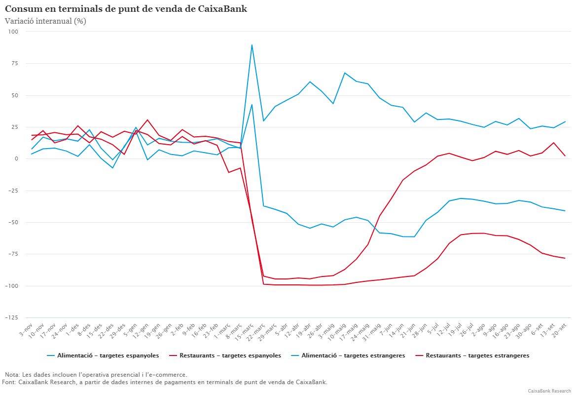 A partir del juliol, amb el relaxament de les mesures de confinament, es va començar a observar una tendència gradual a la desacceleració de la despesa en alimentació. Així i tot, la demanda continua sent inusualment elevada: al final de setembre, la despesa amb targeta en aliments era encara el 20% superior a la de l’any anterior, la qual cosa demostra que la situació sanitària encara continua afectant els patrons de consum de les llars.