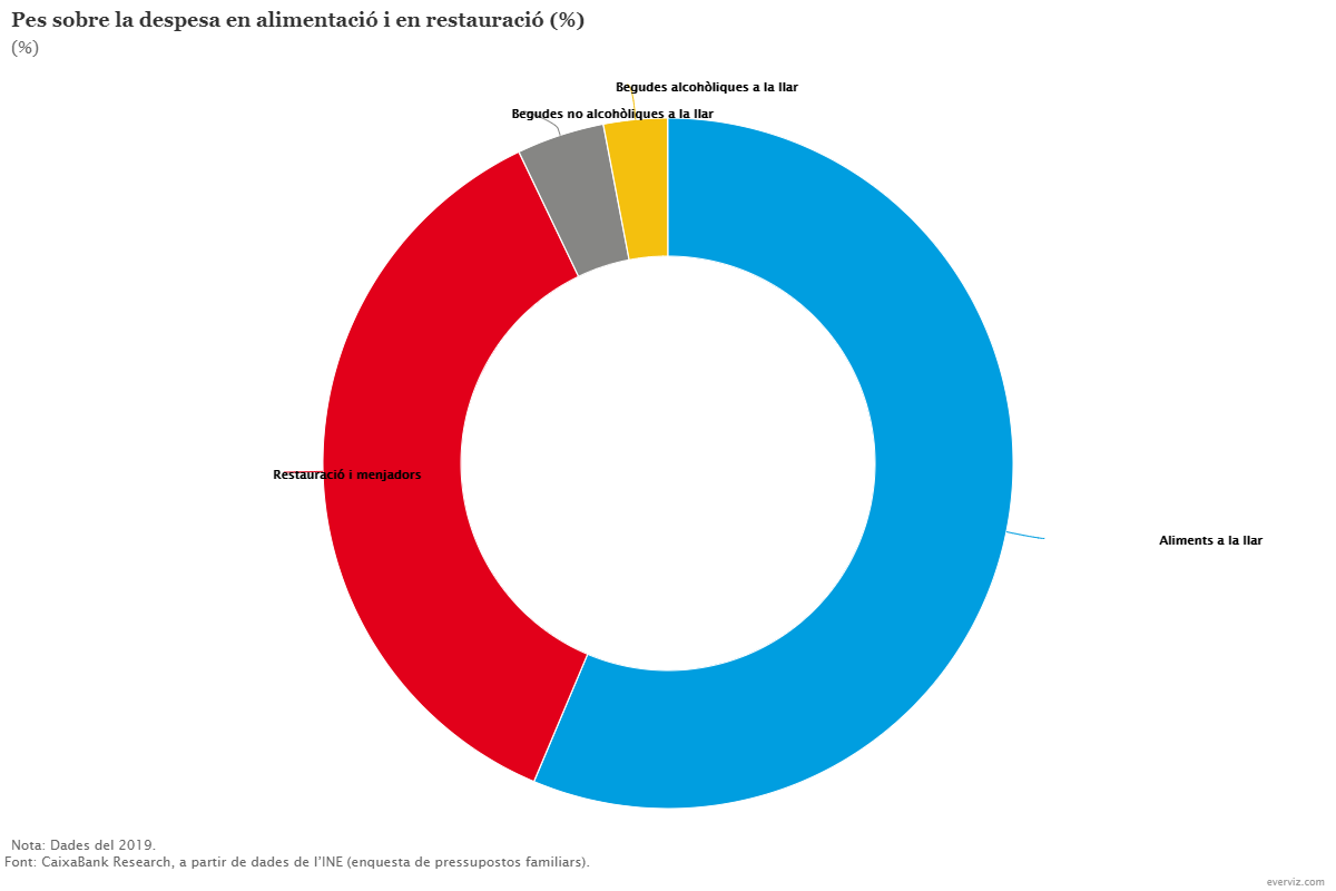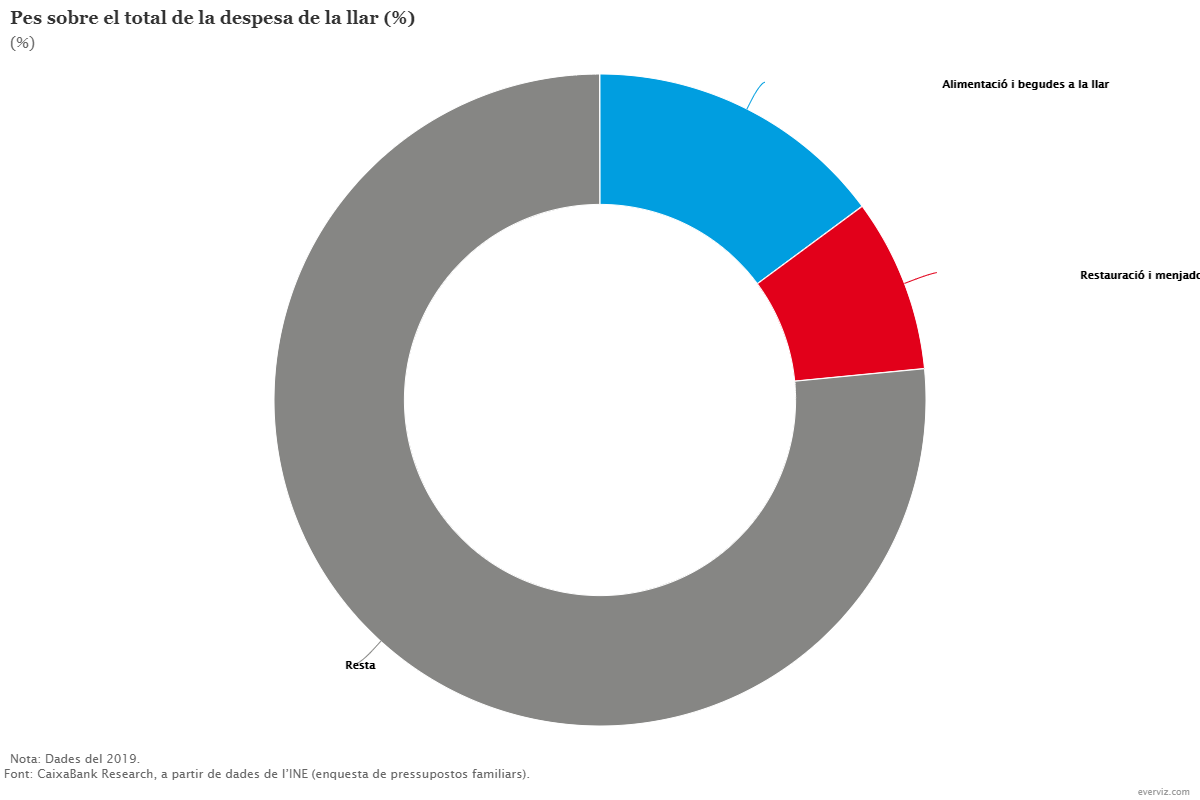 Abans de la crisi del coronavirus, les famílies espanyoles solien efectuar una part significativa del consum alimentari fora de la llar. En concret, el 36,5% de la despesa en alimentació el 2019 (el 8,6% de la despesa total de les llars, equivalent a 48.500 milions d’euros) va tenir lloc fora de casa.1 L’arribada del coronavirus i les estrictes mesures de restricció a la mobilitat per combatre'l van canviar de forma radical els patrons de consum de les famílies, que van deixar de freqüentar els restaurants i altres establiments de menjar col·lectiu per consumir aliments gairebé exclusivament a les llars.