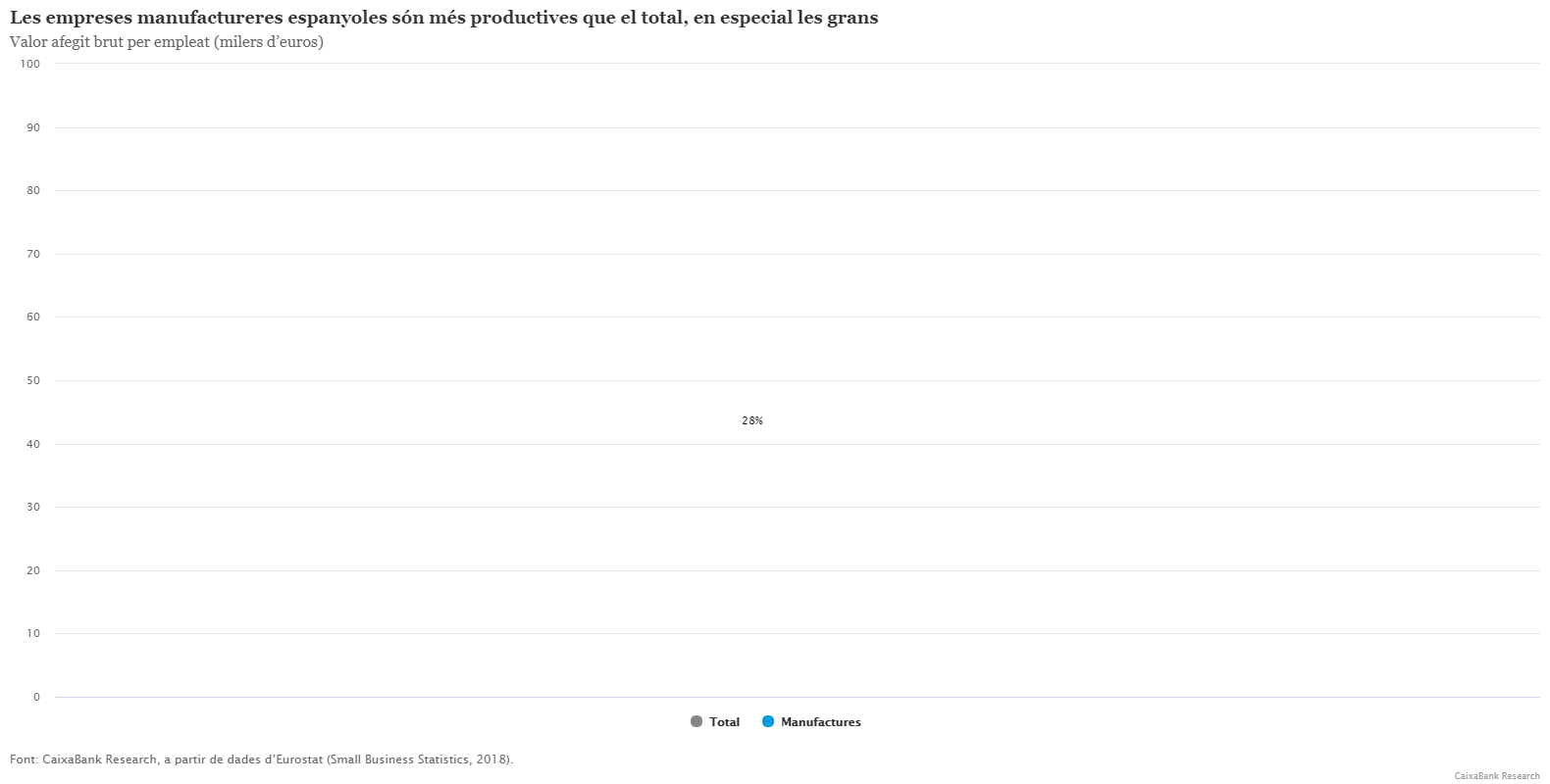 L’economia espanyola disposa d’un sector manufacturer divers, exportador i de productivitat elevada. No obstant això, el teixit empresarial està encara molt atomitzat si es compara amb la indústria alemanya, un referent a nivell europeu. Augmentar la dimensió empresarial i impulsar la productivitat de les empreses, mitjançant la inversió en R+D i l’adopció de les noves tecnologies digitals, per avançar cap a la Indústria 4.0, són les claus per continuar incrementant la competitivitat d’un sector fonamental per a l’economia i per al sector exterior espanyol. Així mateix, el sector ha d’evolucionar cap a un model industrial més sostenible: només les empreses que escometin la transició energètica amb èxit podran competir en un nou entorn en què la sostenibilitat serà un requisit imprescindible per continuar operant al mercat.