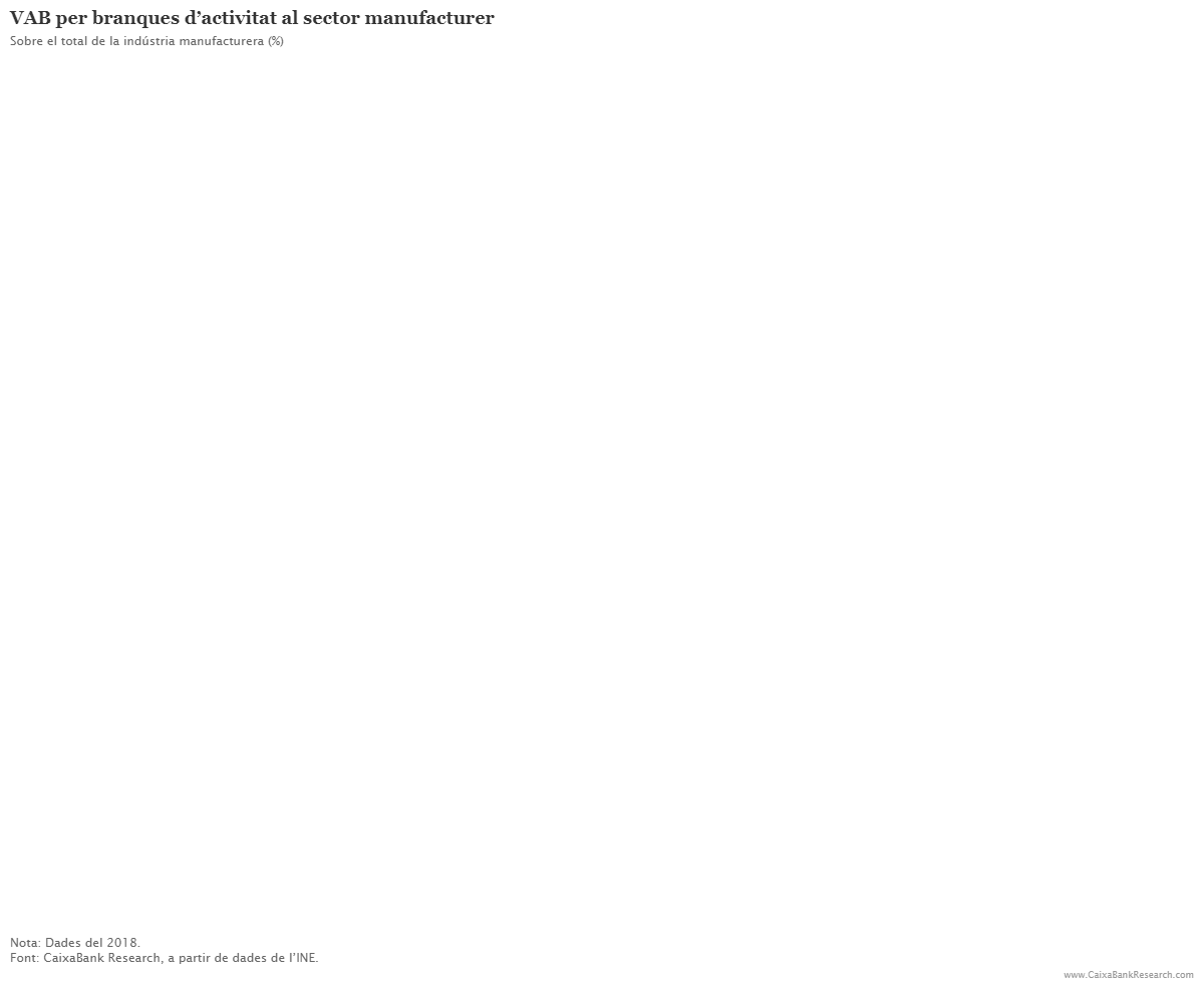 El sector manufacturer engloba activitats molt diverses,9 entre les quals destaquen la indústria agroalimentària (el 18,8% del VAB del sector manufacturer), la indústria de l’automòbil i altre transport (el 12,7%) i la química-farmacèutica (el 12,1%). A nivell territorial, s’observa una especialització productiva diferenciada en funció de les comunitats autònomes, tot i que un factor comú és la indústria agroalimentària, que es troba en el top 3 de les branques manufactureres a totes les regions. Navarra, La Rioja i el País Basc són les regions més industrials, perquè a les tres el pes de la indústria manufacturera és superior al 20% del PIB regional, en relació amb el 12,3% de la mitjana espanyola. D’altra banda, Catalunya és la comunitat que més aporta al total nacional (el 25,1%), seguida de la Comunitat Valenciana (l’11,4%).