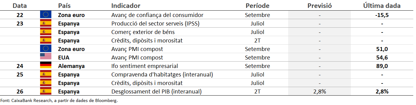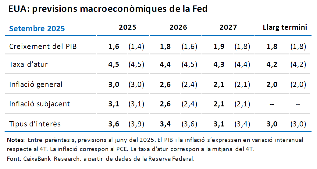 Setmana marcada per la decisió de la Fed i l’activitat d’altres bancs centrals. Els mercats financers han mostrat un comportament mixt en una setmana dominada per les decisions de política monetària, amb una especial atenció a la reunió de la Reserva Federal. Tal com esperava el mercat, la Fed va retallar els tipus d’interès en 25 p. b., fins a l’interval 4,00%-4,25%. Tot i que l’anunci inicial va provocar caigudes en les rendibilitats dels treasuries i pujades en borsa, el to més restrictiu de Powell (que va insistir que la política monetària no té una senda prefixada i que les decisions es continuaran prenent reunió a reunió), va portar a una correcció posterior, amb repunts en les rendibilitats dels bons sobirans i tancament pla en els principals índexs. Els principals índexs borsaris estatunidencs van tancar la setmana amb pujades, mentre que les rendibilitats dels treasuries van augmentar. A la zona de l’euro, les rendibilitats del deute sobirà també van pujar durant la setmana, mentre que les borses van mostrar un to mixt, amb caigudes en el DAX o en l’IBEX i alces en la borsa francesa o l’Eurostoxx 50. El dòlar es va afeblir inicialment enfront de l’euro, que va arribar a marcar màxims de quatre anys, encara que després va corregir fins a nivells per sota d’1,18. No sols la Fed ha tingut reunió de política monetària aquesta setmana, també el Banc del Japó, que va mantenir els tipus (en el 0,5%) i va acordar començar a desfer-se de la seva cartera d’ETF. El Banc d’Anglaterra va deixar el tipus de referència en el 4%, però va acordar retallar el ritme de reducció de tinences de gilts fins als 70.000 milions de lliures, enfront dels 100.000 que venia retallant des que va començar a reduir el seu balanç el 2022. I el Norges Bank va reduir els tipus en 25 p. b. fins al 4% (segona retallada del cicle iniciat al juny), però va adoptar un to més cautelós de cara al futur, i ara espera un tipus d’interès més alt del que es preveia al juny. En matèries primeres, el petroli va repuntar durant la setmana, esperonat a principi de la setmana pels atacs ucraïnesos a infraestructures petrolieres crítiques russes, però va corregir cap al final de la setmana per l’augment dels inventaris als EUA i va tancar al voltant dels 67,4 dòlars per barril. L’or va assolir nous màxims històrics, prop dels 3.700 dòlars per unça, impulsat per les expectatives de relaxació monetària als EUA, encara que també va corregir al final de la setmana.
