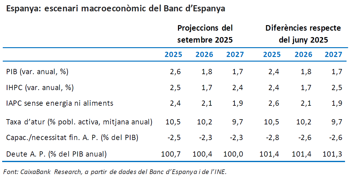 El Banc d’Espanya ha actualitzat el seu escenari macroeconòmic amb una lleugera millora en les previsions per a l’economia espanyola. La institució va elevar el creixement previst del PIB per al 2025 en 0,2 p. p., fins al 2,6%, impulsat principalment per la incorporació de les dades més recents, mentre que va mantenir les projeccions per al 2026 i el 2027 en l’1,8% i l’1,7%, respectivament. Quant a la inflació, a penes va introduir ajustos: va augmentar la previsió per al 2025 en 0,1 punts, situant-la en el 2,5%, va reduir la del 2027 en la mateixa magnitud fins al 2,4% i va deixar inalterada la del 2026 en l’1,7%. Pel costat de les finances públiques, va retallar en 0,3 p. p. la previsió del dèficit el 2025 fins al 2,5% del PIB i va revisar a la baixa la previsió de deute públic per al 2025, del 101,4% al 100,7% del PIB.