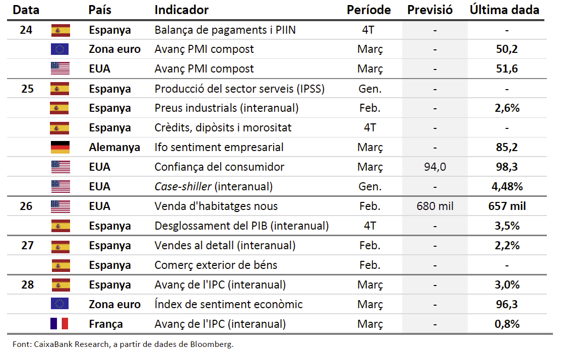 20-3-25 14-3-25 Var. setmanal Acumulat 2025 Var. interanual Tipus (punts bàsics) Tipus 3 mesos Zona euro (Euribor) 2,39 2,48 -9 -33 -154 EUA (Libor) 4,31 4,30 +1 0 -101 Tipus 12 mesos Zona euro (Euribor) 2,38 2,45 -7 -8 -136 EUA (Libor) 4,09 4,02 +7 -9 -95 Tipus 2 anys Alemanya 2,17 2,19 -2 9 -71 EUA 3,96 4,02 -6 -28 -68 Tipus 10 anys Alemanya 2,78 2,88 -10 41 38 EUA 4,24 4,31 -7 -33 -3 Espanya 3,43 3,50 -7 37 22 Portugal 3,30 3,38 -8 45 26 Prima de risc (10 anys) Espanya 65 63 2 -5 -16 Portugal 52 50 1 4 -12 Renda variable (percentatge) S&P 500 5.663 5.639 0,4% -3,7% 8,0% Euro Stoxx 50 5.451 5.404 0,9% 11,3% 7,9% IBEX 35 13.306 13.005 2,3% 15,3% 22,4% PSI 20 6.861 6.771 1,3% 7,6% 11,0% MSCI emergents 1.141 1.120 1,9% 6,1% 8,8% Divises (percentatge) EUR/USD dòlars per euro 1,085 1,088 -0,3% 4,8% -0,1% EUR/GBP lliures per euro 0,837 0,841 -0,5% 1,1% -2,5% USD/CNY yuans per dòlar 7,249 7,237 0,2% -0,7% 0,7% USD/MXN peso per dòlar 20,153 19,932 1,1% -3,2% 20,4% Matèries Primeres (percentatge) Índex global 105,8 104,9 0,8% 7,1% 6,4% Brent a un mes $/barril 72,0 70,6 2,0% -3,5% -16,1% Gas n. a un mes €/MWh 42,9 42,3 1,3% -12,3% 62,3% Font: CaixaBank Research, a partir de dades de Bloomberg.