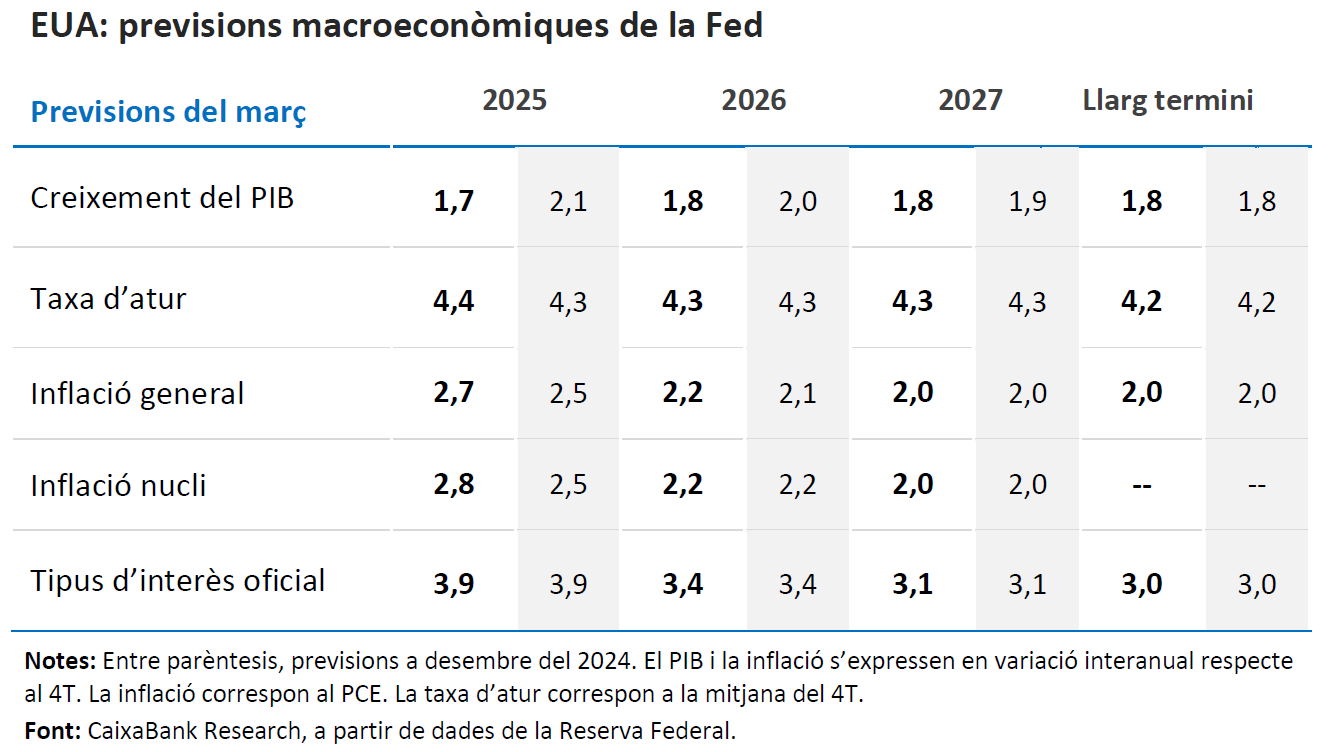 En una decisió unànime i àmpliament descomptada pels mercats financers, la Reserva Federal va mantenir el tipus fed funds en l’interval de 4,25%-4,50%. També va anunciar que a partir de l’abril baixarà la velocitat a la qual redueix el seu balanç, deixant vèncer treasuries a raó de 5.000 milions de dòlars enfront dels 25.000 milions de dòlars previs i es mantindrà el ritme de reducció de mortgage-backed securities (valors recolzats per hipoteques) en 35.000 milions de dòlars. En l’actualització del quadre de previsions, la Fed es va mostrar menys optimista sobre el futur pròxim atès el context actual en què l’elevada incertesa introduïda pels canvis en les polítiques econòmiques de la Casa Blanca ennuvola la capacitat de predir la direcció que prendrà l’economia. Així, la Fed va recalibrar el seu escenari cap a un de més inflació i menor creixement, citant els aranzels i l’elevada incertesa com els factors darrere de la revisió. Malgrat aquest canvi d’escenari, el dot plot va mostrar que el participant mitjà del FOMC continua projectant dues retallades de tipus d’interès el 2025 i unes altres dues el 2026, en part perquè l’efecte d’aranzels sobre la inflació podria ser transitori i perquè l’elevada incertesa va portar als membres del FOMC a deixar sense canvis les seves expectatives «per inèrcia». La decisió de la Fed no va agafar per sorpresa els mercats, que ja anticipaven que els tipus no patirien canvis, però han valorat que la Fed actuarà més per un canvi en creixement que per inflació. Així, la probabilitat descomptada de tres baixades de tipus el 2025 va augmentar gairebé 30 p. p. fins al 65% (vegeu la Nota Breve).