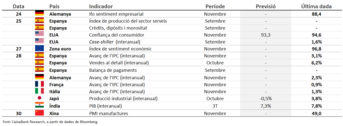 Els mercats financers van tancar la setmana amb un to negatiu, marcat per la correcció en els actius tecnològics i un repunt de la volatilitat en renda variable, en un context de creixent escepticisme per les valoracions i la sostenibilitat del cicle inversor en intel·ligència artificial. Setmana de pèrdues generalitzades als índexs globals, amb una important correcció en la sessió del dijous als EUA, on el Nasdaq va registrar una variació intradia pròxima al 5% i el VIX va repuntar fins a màxims des de l’abril, després de revertir-se l’impuls inicial generat pels resultats d’Nvidia enmig de fortes correccions d’actius especulatius com el bitcoin. En renda fixa sobirana, la corba nord-americana es va desplaçar a la baixa, més intensament en el tram curt, en un context de cerca de refugi i malgrat que els inversors assignen ara una menor probabilitat a una retallada de tipus per part de la Fed al desembre (35% enfront del 43% de la setmana anterior) després d’una dada d’ús del setembre mixta. Els tipus sobirans europeus van registrar moviments similars, però de menor intensitat, i les primes de risc perifèriques van romandre pràcticament planes, a excepció de França, on la falta d’acord sobre els pressupostos va generar una certa pressió a l’alça. En divises, el dòlar es va enfortir enfront dels seus principals parells, en línia amb la revisió a la baixa de les expectatives de retallada de tipus per part de la Fed. El ien es va afeblir després de les declaracions del nou Govern japonès, que va mostrar disposició a mantenir una política fiscal expansiva. En matèries primeres, el petroli Brent va caure durant la setmana, pressionat pel costat de l’oferta per la represa d’operacions en terminals russes i les expectatives d’avanç diplomàtic per aconseguir algun tipus d’acord a la guerra a Ucraïna.
