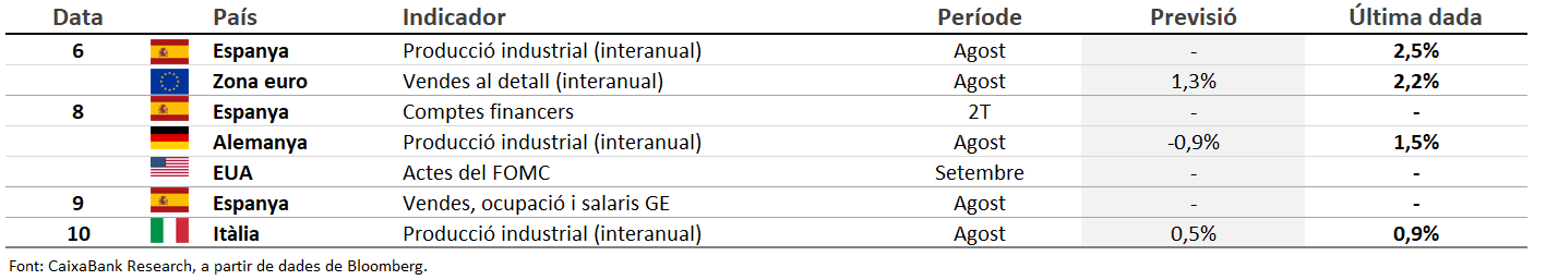 Els mercats financers han mostrat un to mixt en una setmana marcada per la publicació de dades clau d’ocupació als EUA i inflació a la zona de l’euro, i per l’inici del shutdown als EUA. Les borses van registrar avanços a banda i banda de l’Atlàntic, amb el Nasdaq, l’S&P 500 o l’Eurostoxx aconseguint màxims històrics, mentre que les rendibilitats sobiranes van cedir tant als EUA com a la zona de l’euro. Als EUA, les dades del mercat laboral van mostrar senyals de feblesa (descens en l’ocupació privada segons ADP i menor contractació segons JOLTS), tot i que l’informe oficial d’ús del setembre va ser suspès pel tancament governamental. L’euro es va enfortir lleugerament enfront del dòlar (+0,1% durant la setmana), que va tancar al voltant d’1,173. A la zona de l’euro, les dades d’inflació del setembre van mostrar un lleuger repunt en la taxa general (2,2% interanual), mentre que la subjacent es va mantenir estable en el 2,3%. Els PMI finals van confirmar la feblesa a França i la resistència d’Alemanya, amb l’agregat de la zona de l’euro en zona d’expansió. En el pla creditici, Moody’s (A3, perspectiva estable) i Fitch (A, perspectiva estable) van elevar un graó la qualificació del deute sobirà d’Espanya, seguint la millora iniciada per S&P fa dues setmanes (A+). En matèries primeres, el petroli va corregir amb força durant la setmana (el Brent va caure fins per sota dels 65 dòlars per barril, –8,6% en la setmana), afectat per l’augment d’inventaris als EUA i les expectatives d’una nova pujada de producció per part de l’OPEP+ a la reunió que celebraran aquest cap de setmana. L’or, per part seva, va continuar augmentant durant la setmana, en un context de més incertesa.