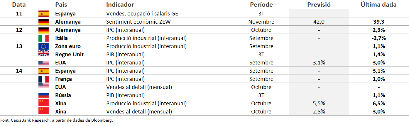 La combinació d’un repunt en la creació d’ocupació segons l’enquesta ADP i una sòlida lectura de l’ISM de serveis van contrastar amb un rècord de retallades d’ocupació segons l’índex Challenger, la qual cosa no va buidar la incertesa sobre la salut del mercat laboral i el rumb de la política monetària. Així, les expectatives dels inversors d’una nova retallada de tipus per part de la Fed al desembre es van moure en un rang estret (entre el 60% i el 70%) i acaben la setmana sense canvis nets rellevants. Això es va reflectir en una evolució dispar dels actius: la rendibilitat dels treasuries va oscil·lar, amb caigudes puntuals després de les dades de Challenger, però sense un moviment net setmanal significatiu. També el dòlar va patir aquests moviments d’anada i tornada i va tancar la setmana sense gairebé variació enfront dels seus principals parells, inclòs l’euro. A Europa, els tipus sobirans també es van moure en rangs estrets, amb lleugers repunts després d’uns PMI finals millors de que s’esperava, especialment a Alemanya, i amb una lleu ampliació dels diferencials perifèrics. La renda variable global tanca la setmana amb correccions, llastada per la presa de beneficis i els dubtes sobre les valoracions en el sector tecnològic, especialment l’estatunidenc, amb el Nasdaq mostrant el pitjor acompliment entre els grans índexs. A la zona de l’euro, el retrocés va ser igualment generalitzat, encara que l’IBEX 35 va aconseguir tancar en positiu, secundat pel bon comportament del sector bancari. En matèries primeres, caigudes del petroli, en un context en què la feblesa de la demanda global (acumulació d’inventaris als EUA i alentiment del ritme de compres a la Xina) no té l’aire de ser contrarestada pels plans de reducció de l’oferta, fins i tot encara que l’OPEP+ hagi decidit pausar els increments de producció a partir del gener. El preu del gas natural europeu, per part seva, va repuntar impulsat per expectatives de major consum estacional davant les previsions de baixes temperatures.