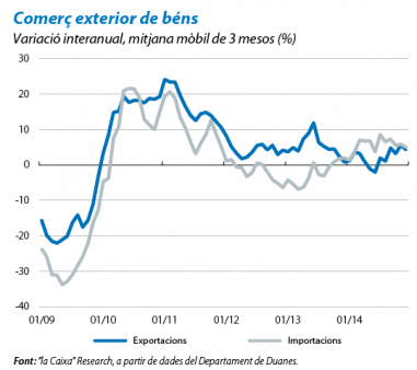 El sector exterior se sumarà, a poc a poc, al creixement. El bon comportament de la demanda interna explica gairebé la totalitat de l'avanç del PIB en el 4T, però també cal destacar que la demanda externa va deixar de restar al creixement per primera vegada en aquest episodi de recuperació. De tota manera, per al conjunt de l'any 2014, en què el creixement del PIB va assolir l'1,4%, l'aportació de la demanda interna va ser de 2,2 p. p. i l'aportació de la demanda externa va ser negativa, en concret de –0,8 p. p. Esperem que la depreciació de l'euro i la recuperació de la zona de l'euro impulsin les exportacions al llarg del 2015, de manera que el sector exterior vagi millorant, a poc a poc, la seva aportació al creixement. No obstant això, aquesta aportació serà limitada, ja que les importacions, esperonades per la demanda interna, continuaran creixent amb força.