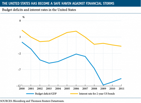 For the present, the markets are rewarding the US approach and the consensus of analysts expects the United States to grow by close to 1.8% in 2012 while the euro area will enter into recession (with an estimated fall of 0.3%). For investors, the United States has become a safe haven as, since the start of the crisis, yields on US bonds have fallen to record lows, even paying out negative returns. Apart from the liquidity injection carried out by the Federal Reserve, global uncertainty has acted as a balm on the United States' national accounts.