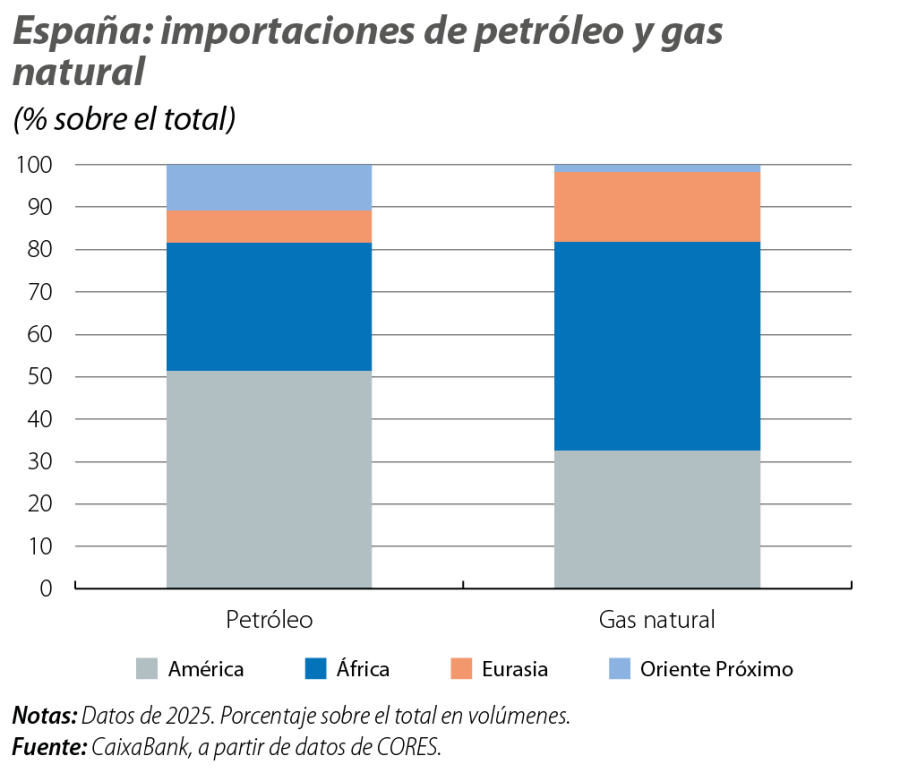 En comparación con el conjunto de la UE, España presenta una exposición algo menor al Golfo Pérsico, pero una mayor dependencia de Argelia y Nigeria en las importaciones de petróleo y gas, así como de EE. UU. en las importaciones de gas. El peso del gas de origen argelino en las importaciones constituye una ventaja comparativa, ya que su transporte se realiza fundamentalmente por gasoducto. Este tipo de suministro es menos susceptible de ser redirigido a otros mercados y, por tanto, tiende a ser más estable que el de gas natural licuado (GNL). Asimismo, esta menor capacidad de redireccionamiento, junto con la ausencia de costes asociados a la licuefacción y regasificación, tiende a traducirse en un precio más reducido frente al GNL.