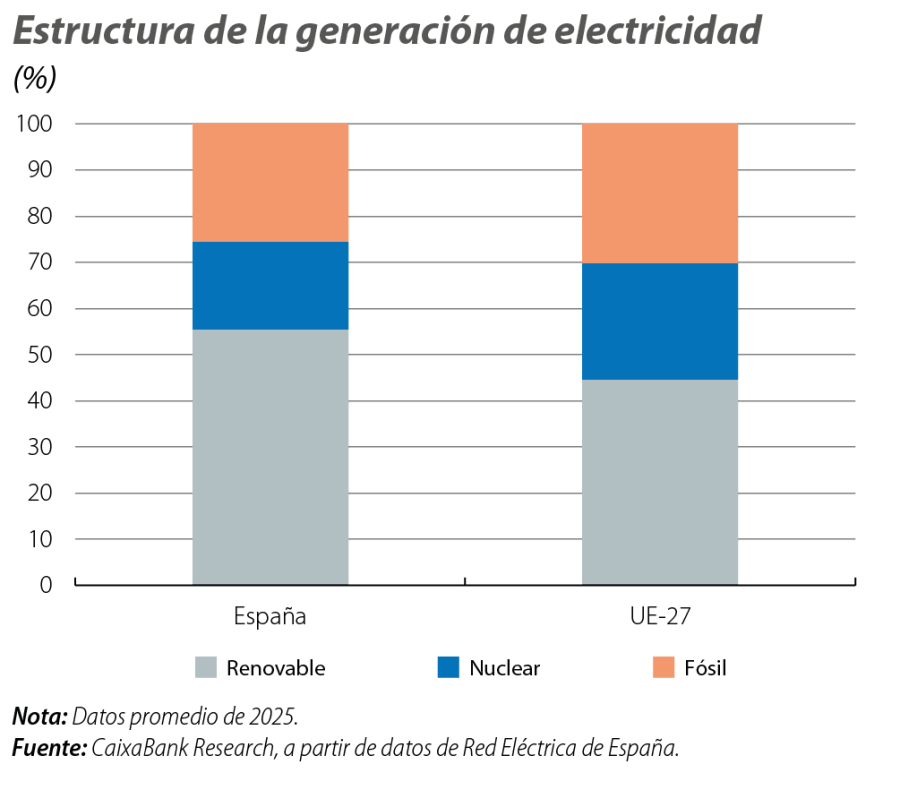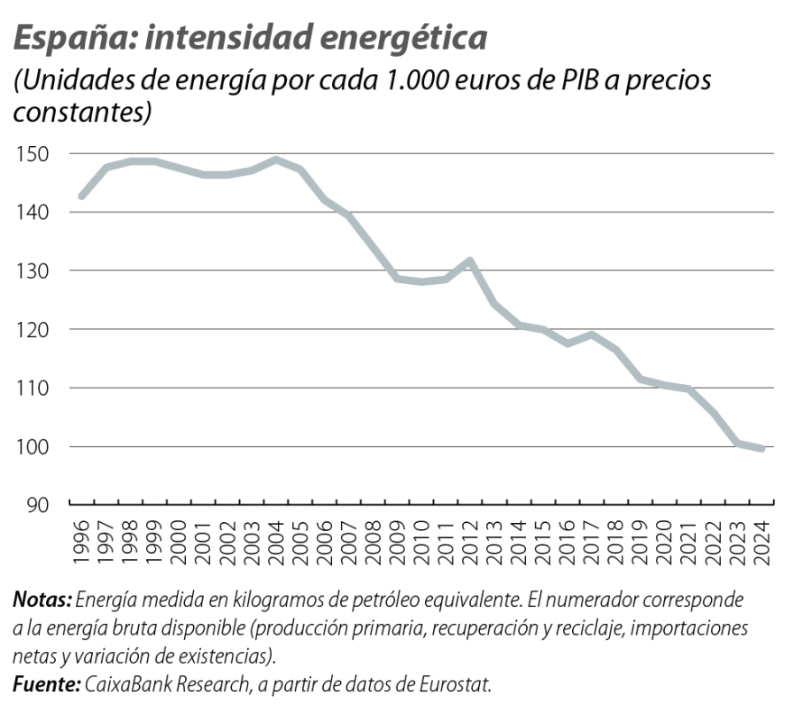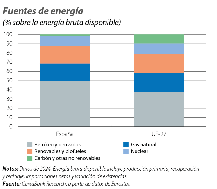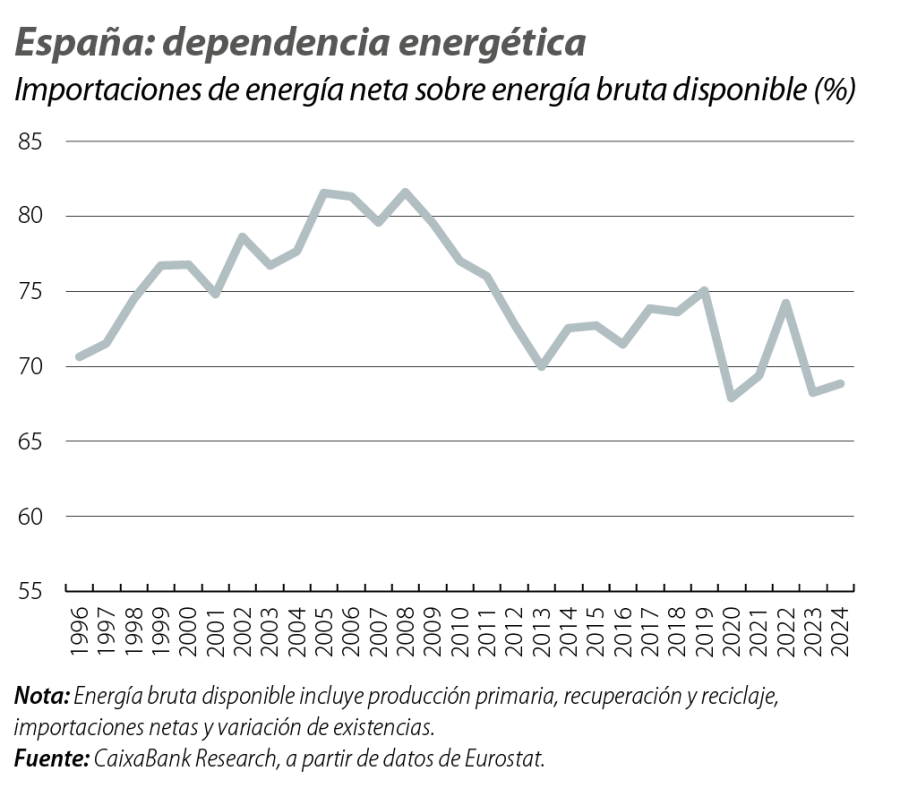 Otro factor estructural relevante es la mejora acumulada en la eficiencia energética de la economía española. Desde comienzos de siglo, la intensidad energética, medida como la cantidad de energía necesaria para generar 1.000 euros de PIB a precios constantes, se ha reducido en torno a un tercio. Este avance contribuye a amortiguar el impacto macroeconómico de un encarecimiento de la energía, al limitar el aumento de los costes de producción y, en última instancia, a los precios finales. Frente a estos elementos favorables, el principal punto débil de España sigue siendo su elevada dependencia energética del exterior: un 70% de las necesidades energéticas tienen que cubrirse con importaciones, una tasa que tan solo es 5 p. p. menor que a principios de siglo.