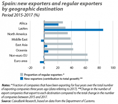 The second element to highlight is the notable rise in the number of new export companies that can be seen in 2017. Specifically, this figure went from 72,000 new export companies in 2016 to more than 82,000 in 2017. This represents an increase of 14%, similar to that observed between 2010 and 2014, only this time with a significantly higher starting point. Thus, if the survival rate remains at current levels, the number of new regular export companies could exceed 8,500 within the next few years, which would be a new record. Nevertheless, there is an element that suggests caution. In particular, the bulk of the growth among new export companies is concentrated in the countries of Latin America, a region in which the survival rate has generally been somewhat lower.3 In contrast, the number of new export companies expanding into EU countries, where the survival rate tends to be higher, has declined slightly.
