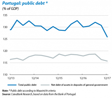 Public debt continues to fall. After fluctuating for several years around 130% of GDP, in December 2017 Portugal’s public debt fell by 4.2 pp compared with the same month the previous year, down to 125.9% of GDP. The factors supporting this reduction has been greater fiscal effort, faster growth and, as already mentioned, a fall in the country’s risk premium. Over the next few quarters, we expect Portugal’s debt to continue decreasing thanks to faster growth in GDP, reaching around 123.2% of GDP by the end of 2018, 1 pp below the target set by the European Commission (124.2%).