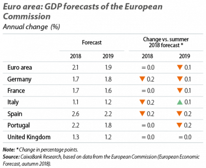 In the euro area, the latest indicators suggest a moderate growth rate at the beginning of Q4. Specifically, the composite PMI index for the whole of the euro area, which measures business sentiment, fell to 52.4 points in November, 5 decimal points below the figure for October and the lowest since December 2014. This, together with a somewhat disappointing GDP in Q3 (0.2% quarter-on-quarter growth), has led us to slightly reduce our forecasts for 2018 (1.9%) and 2019 (1.8%). This environment of growth rates that are more moderate, albeit nonetheless healthy, was also reflected in the European Commission’s new growth forecasts. In the autumn update of its economic scenario, the Commission revised its forecast for 2019 down (by –0.1 pp) to 1.9% (1 percentage point higher than our forecast), due to the slower growth expected in the external sector. However, it also noted that the growth of the euro area will continue to rest on the improvements in the labour market and on accommodative financial conditions. With regards to Germany, the disappointing GDP figure for Q3 (–0.2% quarter-on-quarter) confirmed the omens of a temporary slowdown in that quarter due to a negative contribution of net exports and lower car production levels (associated with the new emissions regulations that came into force on 1 September).