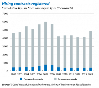 The recovery in the labour market is picking up its pace. In May the number of registered workers affiliated to Social Security increased for the ninth consecutive month (56,600 people, seasonally adjusted). This improvement in the labour market has generally been concentrated in the services sector although industry and construction also contributed positively to employment growth that month. Employment contract figures also reflect the upturn in the labour market. Specifically, the total number of new contracts between January and April this year was 16.5% higher than the figure for the same months in 2013. Although the vast majority were temporary, as is to be expected, it is worth noting that permanent contracts grew faster in March and April after the commencement of new incentives to give permanent employment contracts. If this tone continues over the coming months, it should have a positive effect on stable employment and, in turn, this should boost private consumption. This situation should also be helped by the fact that, in 2014 Q2, the expectations for unemployment over the next 12 months are at very low levels not seen since 2000, namely –3.1 points.