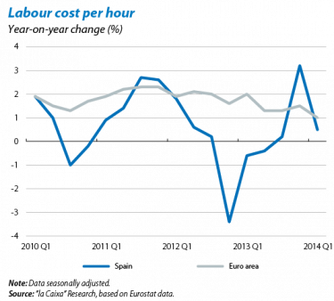 Wage moderation continues. In 2014 Q1, labour costs increased by 0.5% year-on-year (0.1% quarter-on-quarter) according to the harmonised index of labour costs, a lower rate than the euro area as a whole which was 1.0%. This means that Spain continued to gain in competitiveness but there are notable differences in wage trends between sectors. In Q1, the wage adjustment was concentrated in the private sector as the public sector posted a rise of 0.4% quarter-on-quarter. It was also noted that those sectors whose activity has recently improved, such as hotels and restaurants, recorded positive rates of growth in wage costs. The wage increases contained in new agreements (0.5% year-on-year in May) suggest that labour costs will remain contained. Nonetheless, workers' purchasing power should not decrease while inflation remains at a low level, important for the revival in domestic demand.