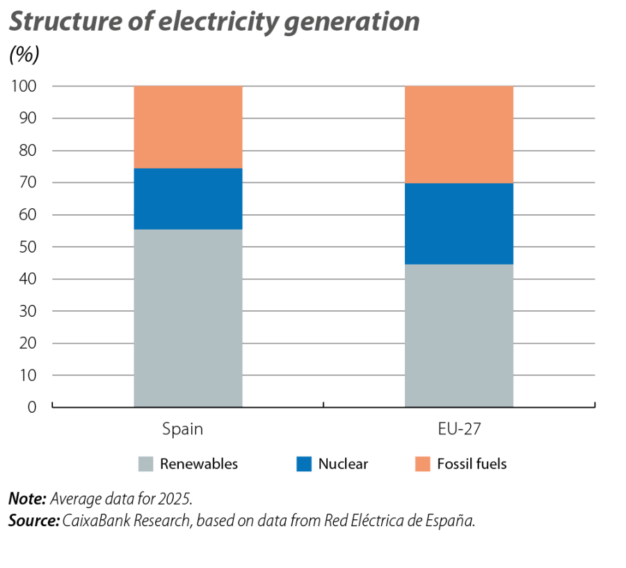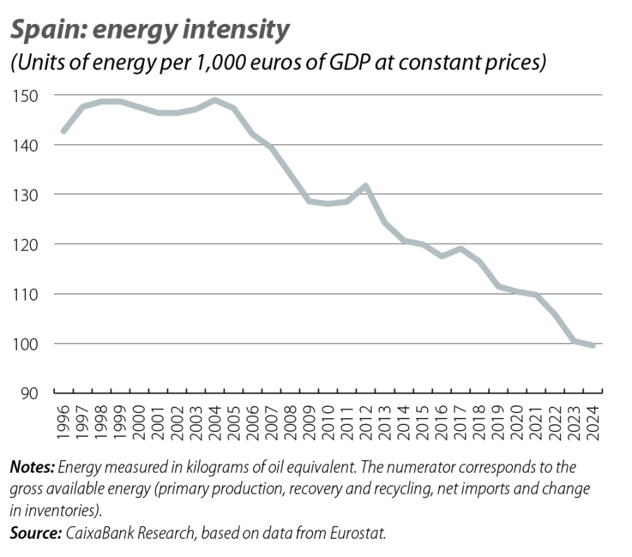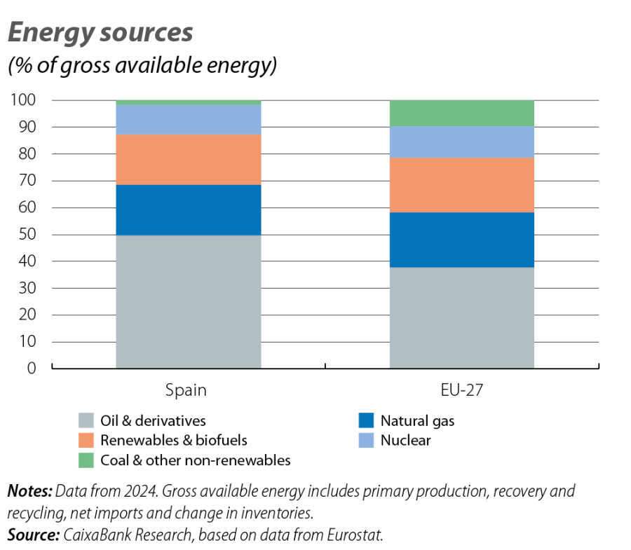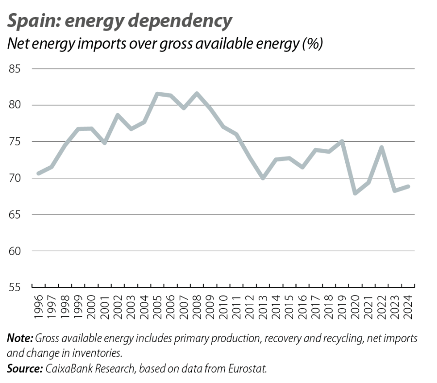 Another relevant structural factor is the accumulated improvement in the energy efficiency of the Spanish economy. Since the beginning of the century, energy intensity, measured as the amount of energy required to generate 1,000 euros of GDP at constant prices, has decreased by about a third. This progress helps to cushion the macroeconomic impact of rising energy costs by limiting the increase in production costs and, ultimately, in final prices. Opposing these favourable elements, Spain’s main weakness remains its high energy dependency on foreign sources: 70% of the country’s energy needs must be met through imports, a rate that is only 5 percentage points lower than at the turn of the century.