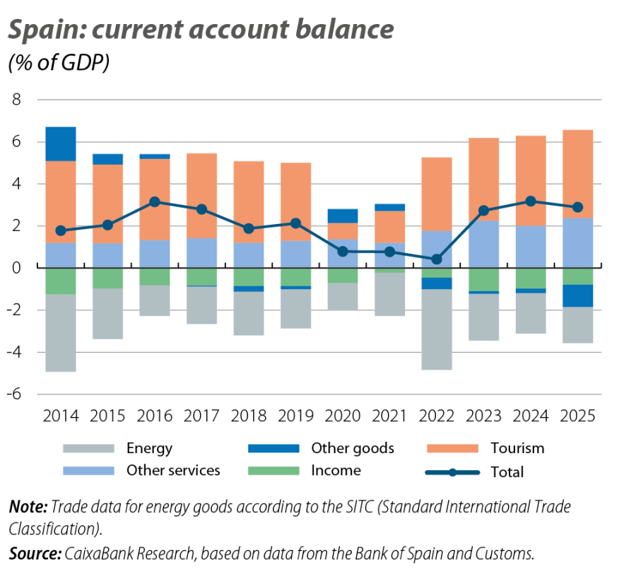 The challenging international environment in 2025 – marked by US tariff hikes, the slowdown in global trade and heightened uncertainty – foreshadowed a significant deterioration in Spain’s current account balance, which had been performing excellently with uninterrupted surpluses since 2012. These factors led us, in mid-2025, to revise downwards the current account surplus forecast to 2.3% of GDP. However, the balance has ended up being better than expected, thanks to other more favourable factors, such as the containment of international energy prices and the dynamism of service exports, including both tourism services and, above all, non-tourism services. Consequently, the deterioration of the current account balance was very limited, resulting in a surplus of 2.9% of GDP, just 0.3 percentage points below the historic figure of 2024.
