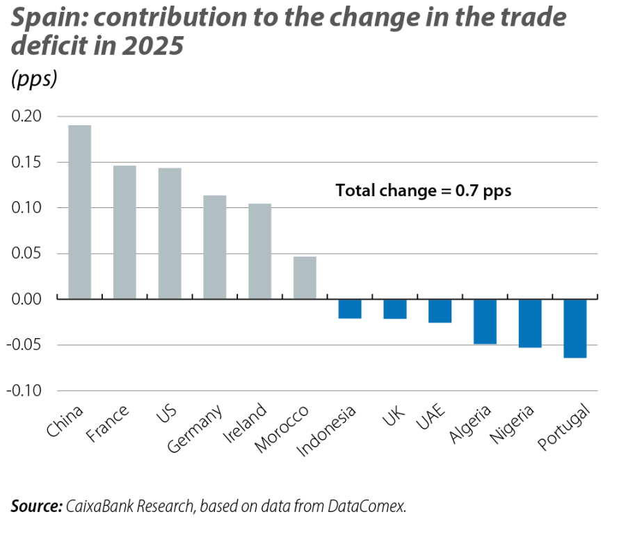 One of the key elements of the international landscape in 2025 was the US tariff hikes. The exposure of the Spanish export sector to the North American economy is limited (as of 2024, exports of Spanish goods to the US account for 1.1% of GDP, compared to 3.2% in the case of the EU), and this has cushioned the direct impact.3 However, the sharp decline in sales to the US (–8.0%), especially of oils, chemicals and crude oil derivatives, is compounded by vigorous imports (+7.0%), driven in recent years by the energy sector.4 This results in a notable widening of the trade deficit with the US, which, in turn, accounts for a substantial part of the deterioration in the overall balance of trade (see second chart).