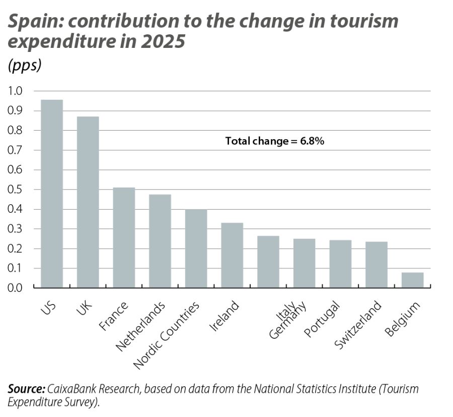 As for the balance of trade in services, it continues to register record surpluses. On the one hand, tourism has once again become the driving force of the current account, demonstrating great resilience despite the global economic slowdown, with a surplus that remained very close to its peak (4.2% of GDP vs. 4.3% previously).5 The depreciation of the dollar against the euro, meanwhile, did not reduce the influx of travellers from the US, which is one of the source markets with the highest average spending.6 On the contrary, it was the market that contributed the most to the growth of total expenditure and, among non-European markets, the one that contributed the most to the growth in tourist arrivals (see third chart).