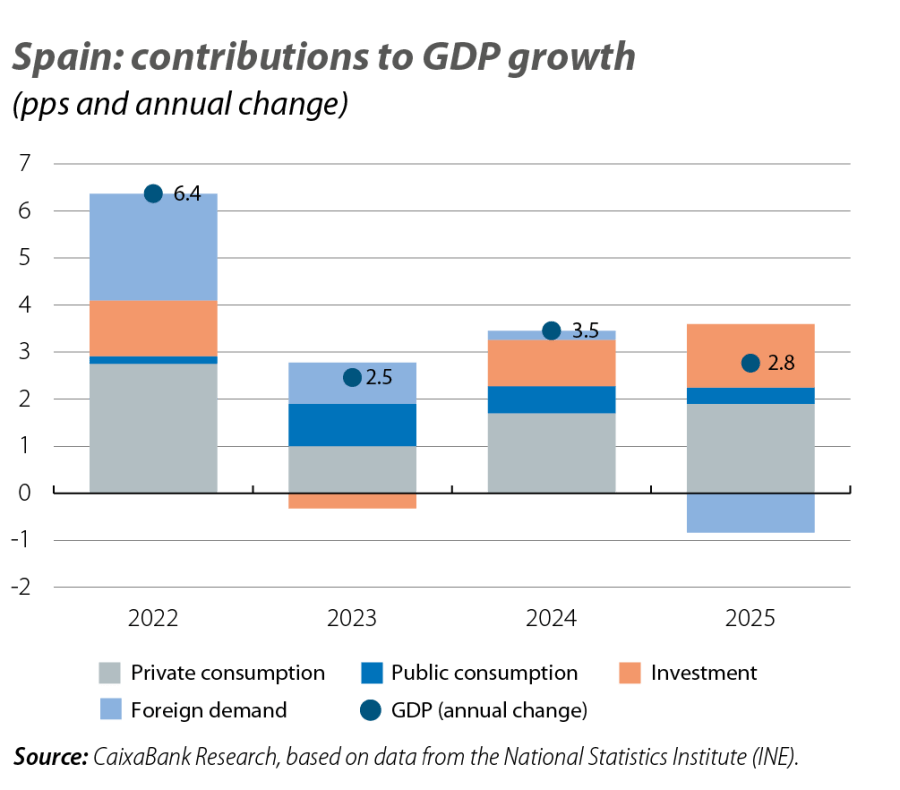 2025 was a good year for the Spanish economy. Despite the tariff challenges, GDP advanced by an impressive 2.8%, almost double the 1.5% recorded by the euro area as a whole. The composition of growth confirmed the shift in growth drivers. Domestic demand, particularly private consumption and investment, drove the expansion, while net foreign demand reduced growth for the first time in years (see chart). This negative contribution does not mean a loss of competitiveness – as we explain in the Focus «Spanish exports amid challenges to their competitiveness» in this same Monthly Report – but rather reflects the weak growth of our main trading partner, the protectionist shift in the US and the sharp increase in imports linked to investment and, to a lesser extent, consumption.