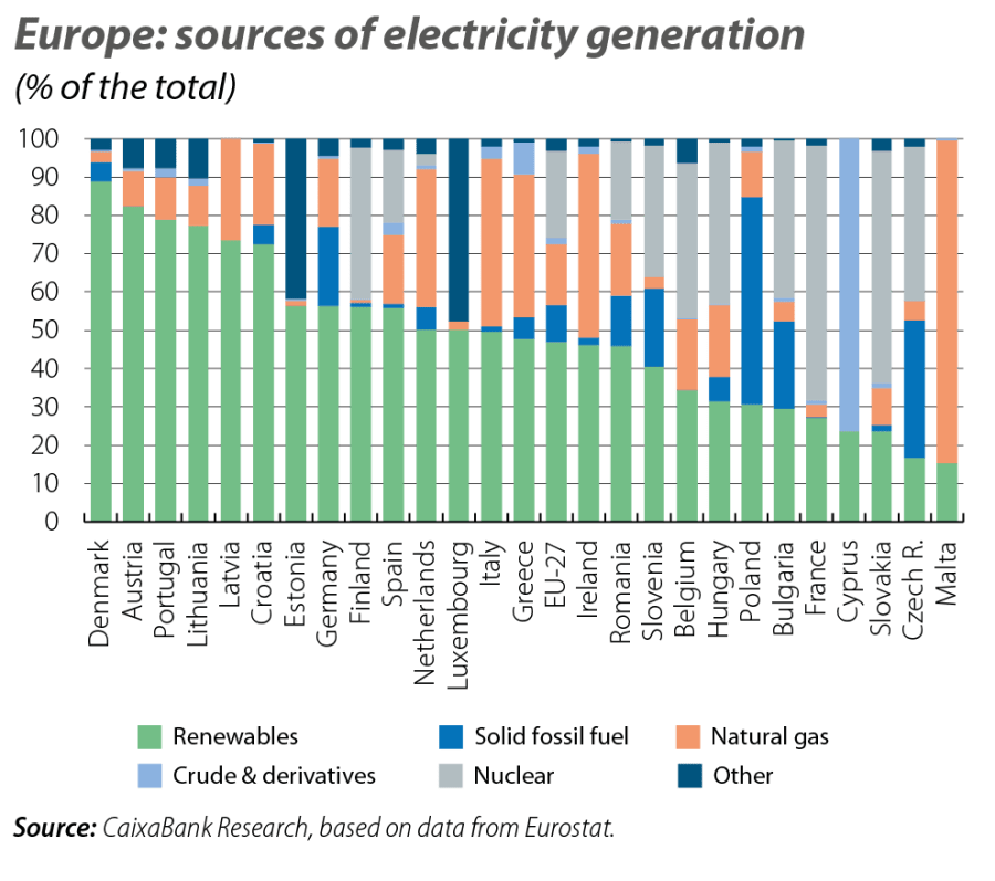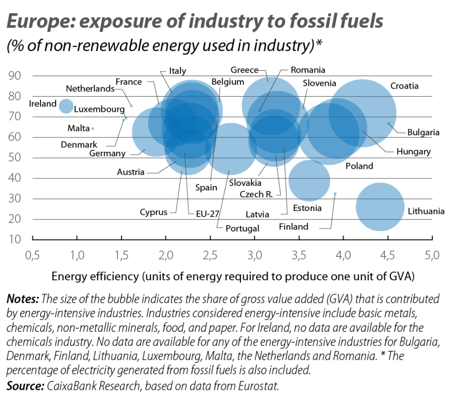 Germany is also noteworthy: its industrial sector, one of the largest in the euro area (almost 21% of GDP), directly consumes more than 37% of all the gas used in the country and nearly 47% of all the electricity. Moreover, 18% of this electricity is generated with gas and 21% with coal. France, on the other hand, shows less sensitivity thanks to its nuclear power plants that cover most of its electricity demand (around 67%) and an economy that is less dependent on the industrial sector (which accounts for only 12% of GDP). Spain and Italy, where industry accounts for 14% and 18% of GDP, respectively, show different starting positions. Industry in Spain accounts for around 60% of the nation’s natural gas consumption and nearly 30% of its electricity consumption, although it has reduced coal-fired electricity generation to less than 1% and combines 56% renewables with 19% nuclear, providing it with a certain buffer. Italy, however, is more vulnerable as its industry accounts for over 30% of the national consumption of natural gas and electricity, but 44% of the country’s electricity is generated with gas and the share of renewables in its production is the lowest among the four major euro area economies.
