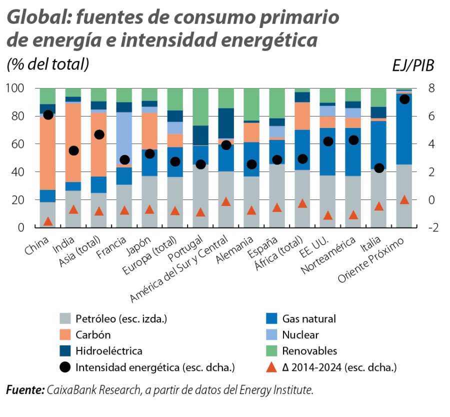 Por otro lado, el mix energético varía de manera significativa entre países, y también así su intensidad energética, es decir, la cantidad de energía necesaria para la actividad económica. En un extremo están los propios países del Oriente Próximo, con una intensidad energética muy elevada y un consumo primario de energía que se deriva casi exclusivamente del petróleo y del gas. Los emergentes asiáticos presentan una intensidad energética también elevada, sobre todo China, pero con un consumo intensivo en carbón. Entre las economías avanzadas, generalmente con menor intensidad energética, destacan los casos de Francia o Japón, con menores dependencias de petróleo y gas, y EE. UU. o Italia, con modelos energéticos intensivos en combustibles fósiles.8