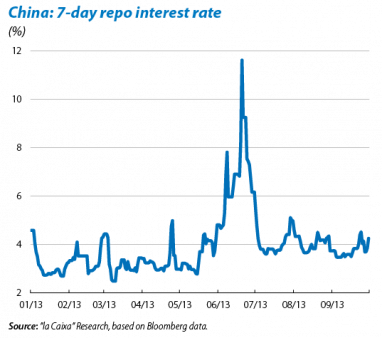 The liquidity conditions in China remain under control. The Chinese central bank has intensified its intervention in the money markets, injecting liquidity with the aim of avoiding episodes of tension such as the one last June. In spite of a turbulence-free interbank market, liquidity has become less abundant compared with the first part of the year, as the authorities had warned, based on their intention to stop any bubbles from forming. Ensuring the financial sector is stable is crucial for the Chinese economy's current process of changing its model of growth. This transition looks complex so that the latest financial imbalances could lead to instability in the short and medium term.