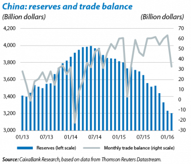 This situation is a cause for concern not only because of the size of the outflows but also because of their acceleration, in spite of the fact that the country's level of reserves is still comfortable according to several measurements used by the IMF. In 2015 China's reserves covered the equivalent of 20 months' imports, a ratio below the 27 months reached in 2009 but still much higher than the 3 months established by the IMF as a benchmark. As a percentage of short-term external debt, the figure, close to 600%, far exceeds the 100% set as a benchmark. The M2 monetary aggregate is the only measurement that considers the size of the country's reserves to be slightly vulnerable: in September 2008 they were equivalent to 28.7% of the M2 aggregate but, since then, have almost halved (down to 15.0% in January 2016), below the 20% set by the IMF as the upper limit of a prudent range. Nonetheless it is worth noting that this last measurement is particularly suitable for economies which, in addition to having a large banking sector, also enjoy a very open capital account, something that is still not the case in China.