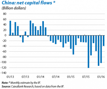 Between July 2014 and January 2016 China's reserves fell by 762.32 billion dollars, reaching 3.23 trillion dollars. Part of this fall was due to the valuation effect suffered by the stock of reserves:1 the depreciation of the euro, the yen and other emerging currencies pushed down the value expressed in dollars although the latter was the predominant currency for the reserves. However, the main factor behind this huge drop in reserves is the capital outflows over the last few months. Neither the considerable limitations that still restrict flows of capital to and from China nor the huge current account surplus of 293.2 billion dollars (equivalent to 2.7% of GDP) in 2015 have been able to offset the net outflows abroad which totalled 637 billion dollars in 2015 and have come close to a trillion dollars since mid-2014.2