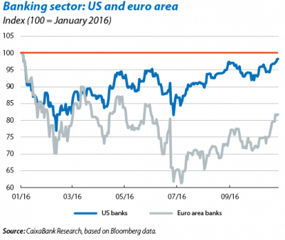 Markets remain calm in a complex environment. The main focuses of attention are still the monetary policy actions that will be carried out by the main central banks in the short and medium term; political risks; the strength of the macroeconomic situation and the resilience of Europe’s banks. The last month has seen positive signs on each of these fronts, albeit to a greater or lesser extent. The market is digesting the more than likely fed funds rate hike in December without any huge problems. Moreover, the rise in sovereign yields this hike will bring about is benefiting bank share prices, which made considerable gains in October. On the macroeconomic front, the figures published have tended to reinforce a scenario of acceleration in the emerging and US economies, in line with the forecasts by CaixaBank Research. Nevertheless the risks remain relatively high, also on all these fronts. In the short term, and in the political sphere, all eyes are on the outcome of the US elections and Italy’s referendum; while as far as monetary policy is concerned the market is anxiously awaiting the ECB’s meeting in December, when it will have to decide whether to extend its quantitative easing programme (QE) in the euro area.