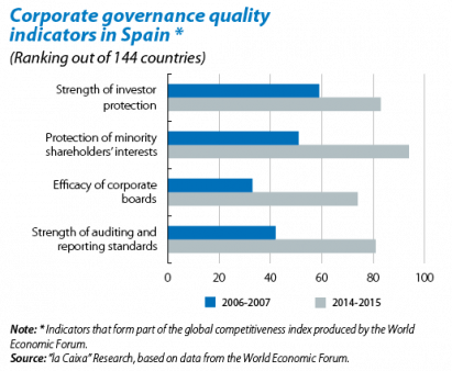 The new code is made up of 25 principles and 64 recommendations and applies to all listed companies irrespective of their level of capitalisation. As in the previous code, it is based on the principle of «comply or explain». Most companies comply with the vast majority of the recommendations (see the first graph), so the new code will force companies to be more transparent in everything related to their corporate governance decisions. Spain has a poor position in international corporate governance rankings and this has worsened in the last few years (see the second graph), so any initiative aimed at good governance is more than welcome.