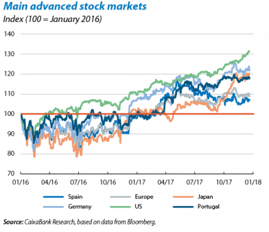 A January of contrasts in the markets. Supported by strong macroeconomic data at the end of 2017 and improved growth prospects at the beginning of 2018, in January sovereign interest rates rose sharply, particularly in the US and the core euro area countries. At the same time, stock markets were bullish in the first few weeks of the month with considerable gains for the main indices in the US, Europe and emerging economies. Sovereign interest rates consolidated their gains after the first meetings in 2018 indicated few policy changes on the part of the European Central Bank (ECB) and as the US Federal Reserve (Fed) reinforced the expectation of three rate hikes over the next 12 months. However, on greater expectations of a gradual tightening of US financial conditions and the ECB moving towards monetary normalisation in 2018, the main international stock markets moderated their gains and started to post losses in the last few sessions of January.
