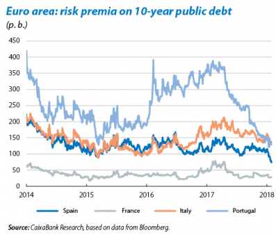 Sovereign interest rates pick up while risk premia fall. Sovereign interest rates rose strongly, especially in the US (interest rates on 10-year Treasury bills rose by more than 30 bp to their highest level since 2014) and Germany. At the same time, the risk premia for euro area peripheral economies fell sharply. Specifically, the Spanish premium benefitted from Fitch’s upgrade of its sovereign rating on 19 January (from BBB+ to A), falling by more than 35 bp to its lowest level since 2009, fluctuating between 70 and 80 bp. Portugal’s risk premium fell by more than 20 bp, reaching its lowest level since 2010, while Italy’s risk premium also decreased by about 20 bp in spite of continuing uncertainty regarding the country’s general elections in March.