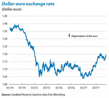 The euro appreciates again against the dollar. After correcting part of its strong appreciation throughout the year, the single currency once again rose in value to above USD 1.19. One of the main reasons for the euro’s slight appreciation in November was uncertainty regarding US tax reforms. However, as these reforms made progress, the dollar started to stabilise towards the end of the month, keeping the euro-dollar exchange rate at USD 1.19. Most of the emerging currencies appreciated further against the dollar in November. One notable exception was the Turkish lira, which continued to lose value given tensions with the US and President Erdogan’s repeated criticism regarding the need to tighten up monetary policy to combat inflation.