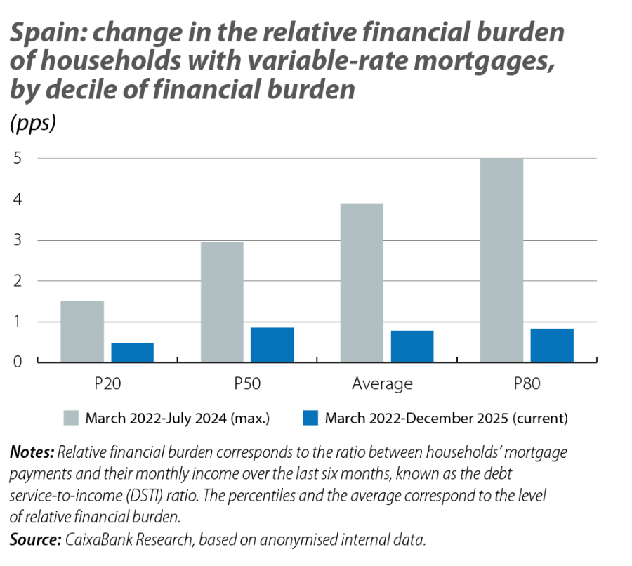Although this may seem like a modest change at the individual level, its aggregate impact is significant. Given that households with variable-rate mortgages account for around 22% of aggregate private consumption in Spain, this increase observed throughout 2025 contributed to raising the aggregate growth in consumption by around 0.4 pps. In terms of GDP, the impact is approximately equivalent to 0.2 pps.