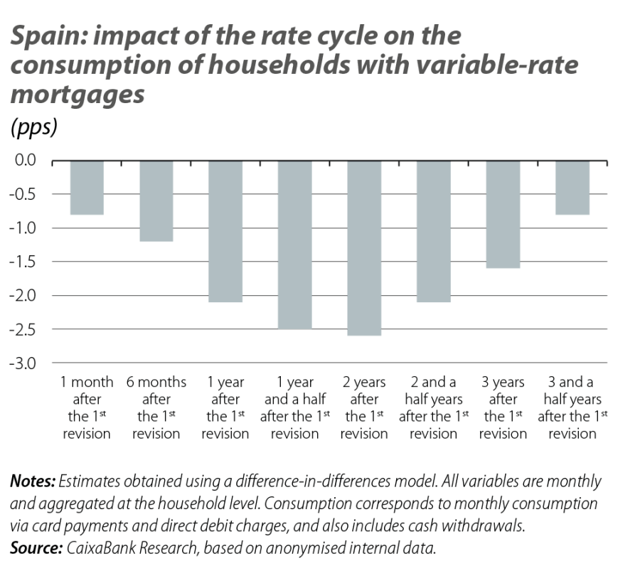In this financial context, and in order to isolate the effect of interest rates from other factors that influence consumption, we conducted an econometric analysis (using a technique known as «difference in differences») which estimates the causal impact of the rise and subsequent fall in interest rates on consumption. Consumption is defined as household expenditure carried out via card payments, direct debit charges and also cash withdrawals. This strategy compares the consumption pattern of households with variable-rate mortgages over the period analysed with that of a control group consisting of households with fixed-rate mortgages. The result reveals the change in consumption observed at any given time among households with variable-rate mortgages compared to a situation with no revision of their mortgage payments.2 Before the start of the rate hike cycle, the spending patterns of households with variable and fixed-rate mortgages were following a practically parallel pattern, reinforcing the validity of this approach.