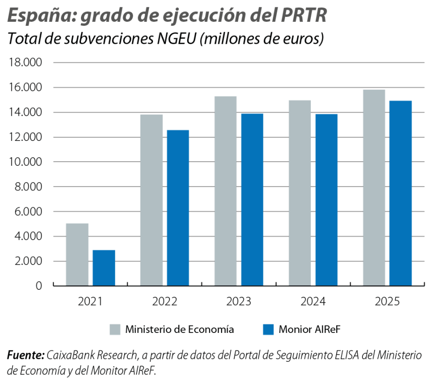 Entre 2021 y diciembre de 2025, se habían «ejecutado» –es decir, resuelto convocatorias y licitaciones por las distintas Administraciones públicas– 59.000 y 64.900 millones de euros en subvenciones del NGEU, según el Monitor de la AIReF y la herramienta ELISA del Ministerio de Economía, respectivamente, lo que equivale a entre el 74% y el 81% del total del programa (79.800 millones de euros).2 El ritmo de ejecución anual en 2025 fue ligeramente superior al de 2024: en 2025 se ejecutaron alrededor de 15.000 millones de euros,3 lo que supone cerca de 1.000 millones más que en 2024, un aumento en el que coinciden ambas métricas.