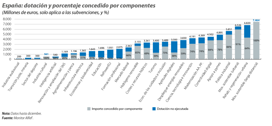El análisis por componentes hasta diciembre de 2025 desarrollado por la AIReF muestra una fotografía heterogénea. El segundo gráfico revela que las áreas con mayor grado de ejecución relativa respecto a la dotación total son movilidad sostenible –tanto urbana como de larga distancia–, conectividad digital y política industrial. En cambio, los retrasos más acusados se concentran en rehabilitación energética y regeneración urbana (que incluye las rehabilitaciones del parque residencial y la construcción y rehabilitación de más de 20.000 viviendas de alquiler social), energías renovables, recursos hídricos, formación profesional y educación, turismo y ciencia y tecnologías. Cabe destacar que faltan por ejecutar casi 2.500 millones en rehabilitación y regeneración y cerca de 2.000 millones de euros en turismo, formación profesional y aptitudes digitales.