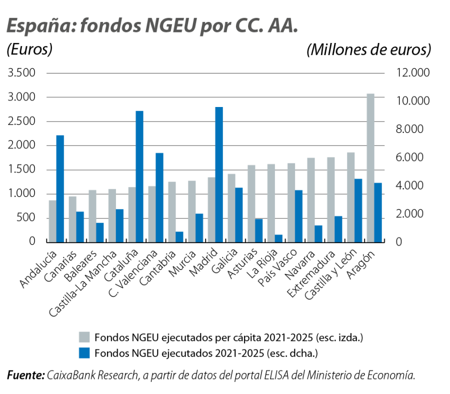 El impacto del NGEU en el crecimiento del PIB de 2026 se estima entre 0,4 p. p. y 0,6 p. p. Este impulso procede de dos vectores diferenciados pero complementarios. Por un lado, en 2026 deberán ejecutarse todos los fondos pendientes en subvenciones: 15.000 millones, según la herramienta ELISA del Ministerio de Economía, y más de 20.000, según la AIReF, aunque 2.800 ya están asignados al Fondo España Crece, que invertirá más allá de 2026. La cifra encaja con el ritmo de ejecución de años anteriores, pero el desafío radica en concentrar toda esta actividad antes del 31 de agosto, plazo límite fijado por el mecanismo europeo. Por otro lado, se espera un mayor dinamismo en los proyectos financiados con préstamos, tras un 2025 en el que su despliegue fue todavía incipiente. Hasta noviembre de 2025, se habían aprobado operaciones financiadas con estos préstamos por alrededor de 7.000 millones de euros y existía, además, un pipeline de proyectos en fase de identificación y evaluación por un importe adicional cercano a 5.000 millones.