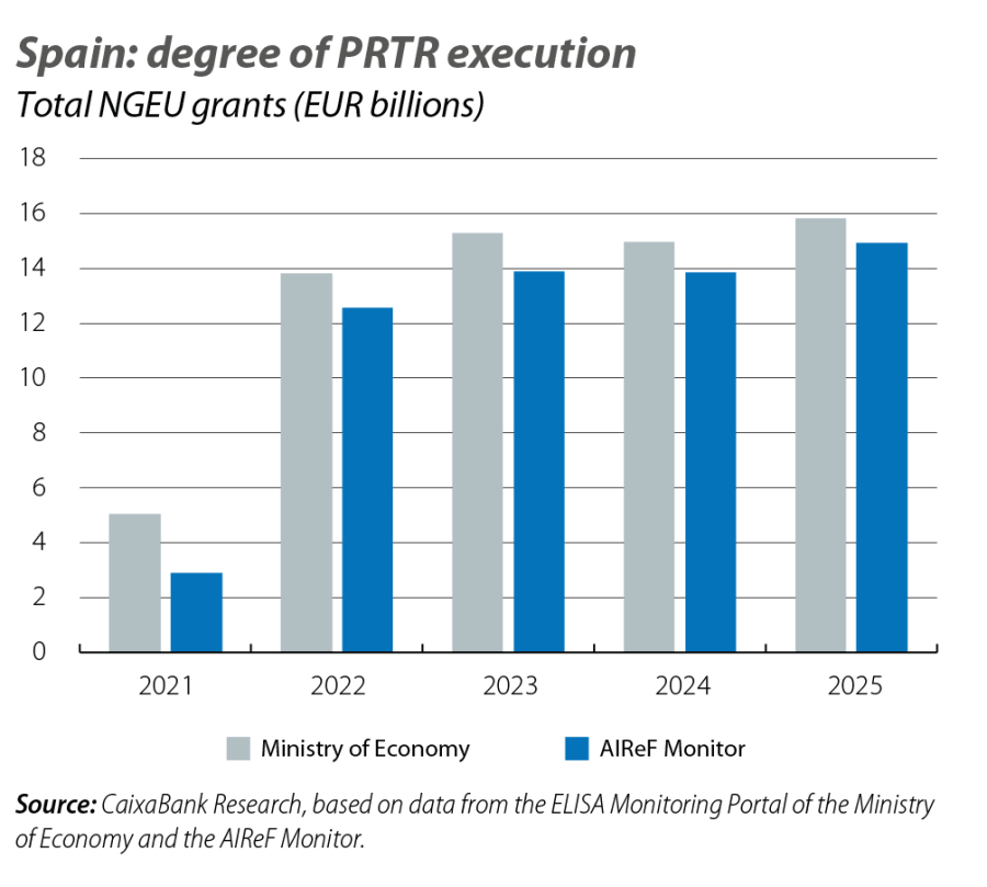 Between 2021 and December 2025, the sum of NGEU grants that had been «executed» – i.e. calls and tenders completed by the various public administrations – amounted to 59 billion and 64.9 billion euros according to the AIReF Monitor and the Ministry of Economy’s ELISA tool, respectively, which is equivalent to between 74% and 81% of the programme’s total (79.8 billion euros).2 The annual execution rate in 2025 was slightly higher than in 2024: around 15 billion euros were executed in 2025,3 which is about 1 billion more than in 2024, an increase on which both metrics agree.