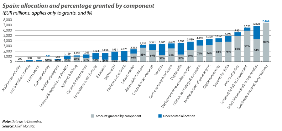 The analysis by component up to December 2025 performed by AIReF shows a mixed picture. The second chart reveals that the areas with the highest degree of relative execution in relation to the total allocation are sustainable mobility – both urban and long-distance – digital connectivity and industrial policy. In contrast, the most significant delays are concentrated in energy refurbishment and urban regeneration (which includes energy-efficiency upgrades to the existing housing stock and the construction and refurbishment of more than 20,000 social rental homes), renewable energies, water resources, vocational training and education, tourism, and science and technologies. It should be noted that nearly 2.5 billion euros in refurbishment and regeneration and around 2 billion euros in tourism, vocational training, and digital skills remain yet to be executed.