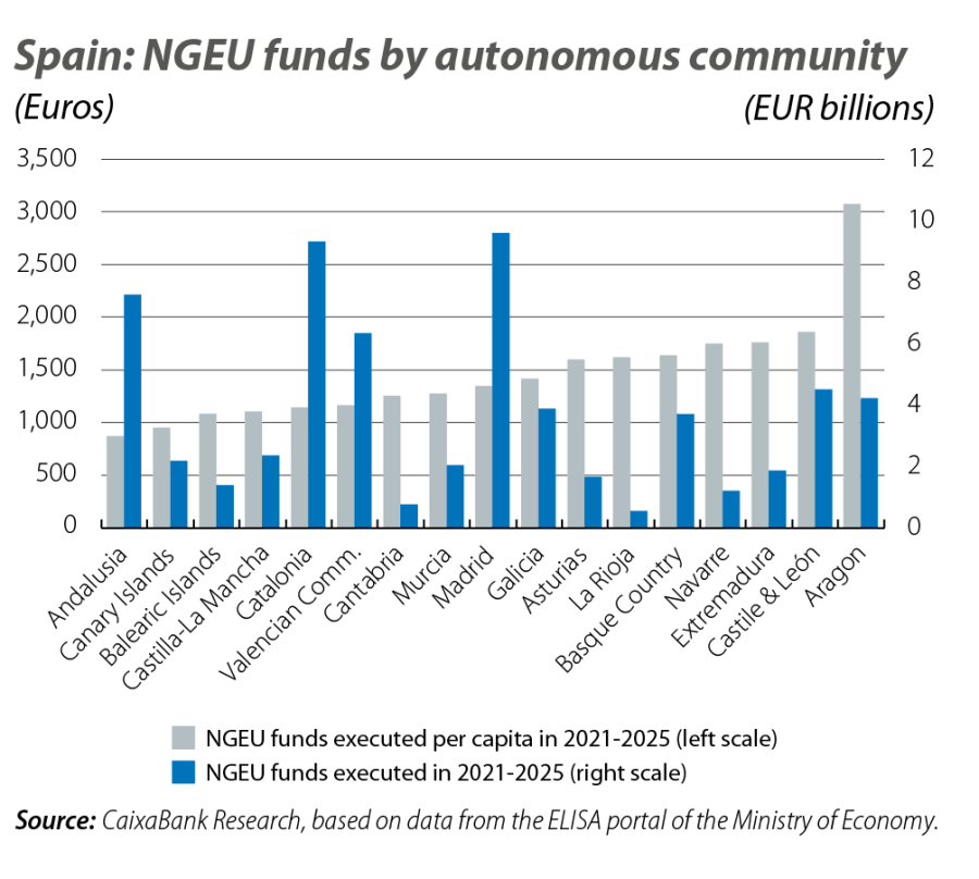 The regional analysis shows that the largest communities in terms of population and GDP are leading the total volume of funds executed.4 However, this advantage diminishes when the data is adjusted per capita. In per capita terms, regions with smaller populations but large industrial projects stand out. These include Aragon, the dynamism of which is explained by investments linked to the strategic PERTE project for electric vehicles – including the battery plant, the expansion of Stellantis and other associated projects. Other regions, such as Asturias and La Rioja, also reflect this pattern, with a high per capita execution.