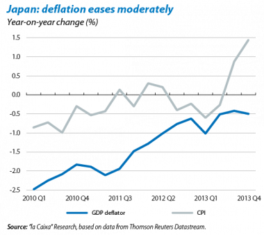 In the area of prices, deflation completely left the Japanese panorama but some qualifications must be made. The CPI rose by 1.4% year-on-year in January, far above 2013's figure of 0.4%. Core inflation (without energy or foods, the most volatile elements) grew by 0.6% year-on-year. Given this situation, it is essential to promote wage rises to achieve the Central Bank's inflation target of 2% , particularly in the basic wage, as this accounts for 80% of the total wages of all employees. To date, the upswing in November and December has been based on increases in overtime. The qualification with regards to prices lies in the GDP deflator, which measures the price level of all goods and services produced by the economy and is still in negative terrain in year-on-year terms (–0.5% in 2013 Q4).