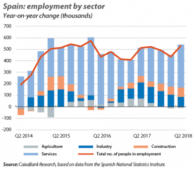 The labour market remains buoyant. In Q2, the increase in the number of people in employment (469,900 people) was much higher than expected by CaixaBank Research (350,000), with the highest quarterly increase ever recorded in the historical series of the Labour Force Survey. In addition, the positive outlook in the labour market has led to an increase in the active labour force (+163.900 people in Q2), bringing the activity rate up to 58.8% (+0.3 pps). Furthermore, the unemployment rate fell sharply, down to 15.3%, which represents a reduction of 1.9 pps in the last year. It should be noted that this decline in the unemployment rate is common in Q2 due to the start of the tourist season. This is reflected in the good performance of the services sector, which generated 371,400 jobs, even more than the number observed in Q2 2017 (272,400). Looking forwards to the next few quarters, the improvement in the labour market is expected to continue, albeit at a more moderate rate (in line with the tempering of the growth rate of the Spanish economy).