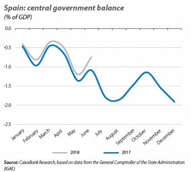 The public deficit continues to fall gradually. Based on the data up to May, the fiscal deficit stood at 1.3% of GDP, 3 decimal points below the figure for May 2017. Although the positive performance of the economy continues to propel revenues (6.2% growth in the year to date up to May), the higher growth of expenditure (4.1%), especially due to the increase in social benefits (3.0%) and gross capital formation (32.4%), has resulted in a more modest improvement in the public accounts.