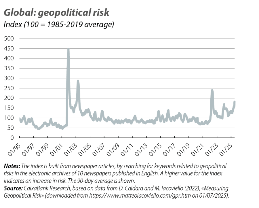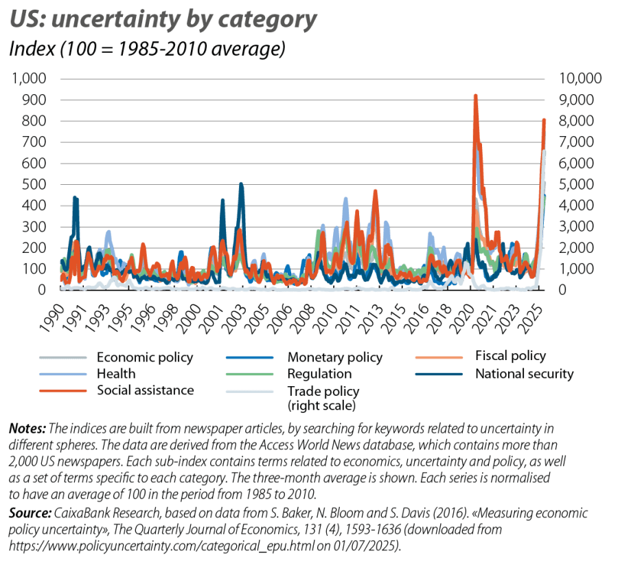 The truce announced between Iran and Israel at the end of June, after days of attacks and a US bombing of three sites linked to Iran’s nuclear programme, was just the latest in a string of episodes of geopolitical tension that have marked recent months and years. While the truce allayed fears of a wider regional conflict and of disruption to the oil supply, this episode reminded us that the economic environment remains subject to the risk of new supply disruptions. Meanwhile, at the summit of NATO country leaders an agreement was reached to increase defence spending to 5% of GDP (3.5% + an additional 1.5% on cybersecurity, infrastructure, etc.). With all the ongoing or frozen conflicts in various regions, the fragmentation of the geopolitical world order will continue to determine the macroeconomic scenario. Another key element of the economic environment is uncertainty. Unlike risk (geopolitical or other), this refers to the difficulty in anticipating events with a certain degree of certainty or probability. This development is particularly visible in the data on uncertainty by category, collected from large databases of US newspapers where, unlike in previous episodes, there is a widespread upturn across all categories. Also, in the US, the main consumer confidence indicators have deteriorated in recent months, while business surveys point to uncertainty, the tariffs and geopolitical risks as being the main challenges.