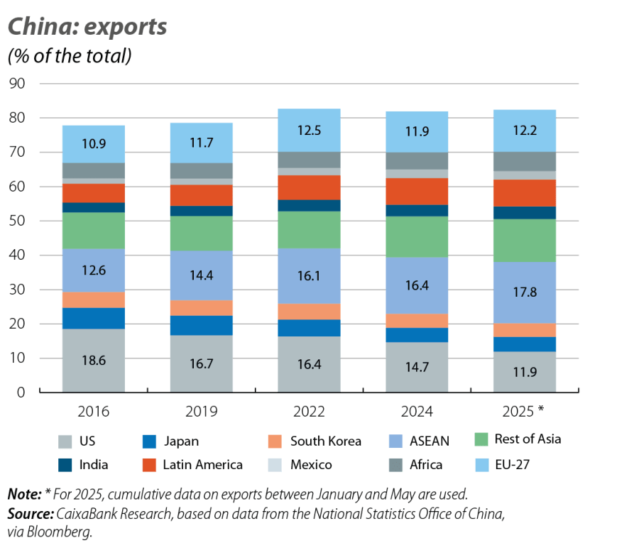 The global manufacturing PMI stood at 50.3 in June and regained its level of March, after two readings below 50 points in April and May. By country, in the US the PMI stood at 52.9 points (a peak since the beginning of 2022). The analysis by component reveals an increase in production in the US last month, but also in purchases of inputs and in prices growth, symptoms of a partial and temporary tariff truce. In the euro area, the manufacturing PMI stood at 49.5 points (a peak since the summer of 2022), while in China it recovered to 50.4 points, after a brief fall in May, placing it at the same level as that of all emerging economies as a whole, where increases were also observed in June. The broad-based improvement in the manufacturing PMI in June, along with the stability of the global PMI at around 50 points so far this year, paints a picture of a global economy that continues to withstand multiple shocks and is growing at a moderate pace. Among other witnesses of the timid outlook for the global economy, we find the economies of Canada and the ASEAN countries, whose PMIs (45.7 and 48.8 points in Q2 vs. 49.9 and 51.0 in 2024, respectively) point to a clear contraction in manufacturing activity in Q2.