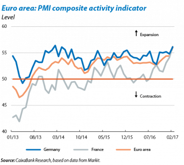 The European economy continues to perform well in the face of uncertainty. GDP growth in the euro area has managed to withstand the episodes of financial instability and political shocks of 2016, as the widespread improvement in activity indicators over the past few months shows. This has resulted in upgraded growth forecasts. CaixaBank Research now forecasts 2017 growth at 1.7%, 0.2 pps higher than its previous forecast. The European Commission has also slightly raised its forecast to 1.6%. However, the outlook is still assailed by political risks (Brexit negotiations and elections in the Netherlands, France, Germany and Italy). Adding to this domestic uncertainty are risks stemming from the US (uncertainty regarding the fiscal stimulus announced by the Trump administration, possible changes in trade policy and the Fed’s monetary policy normalisation). Nevertheless, the euro area’s recovery could gain further momentum if such risks dissipate.